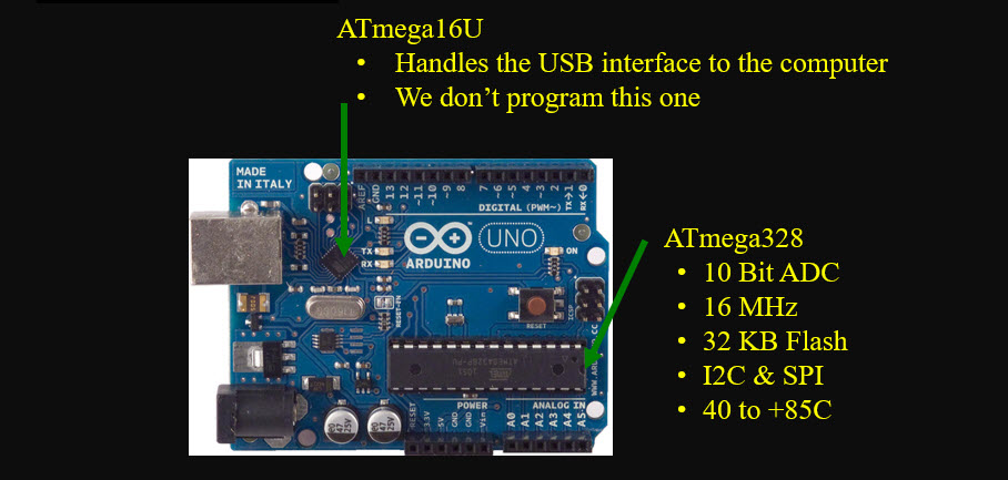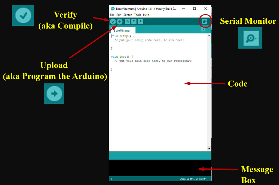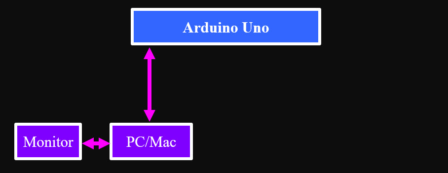 - When you tell the Arduino to upload, it first compiles then uploads (programs) your code (communicating with laptop / desktop and Arduino)