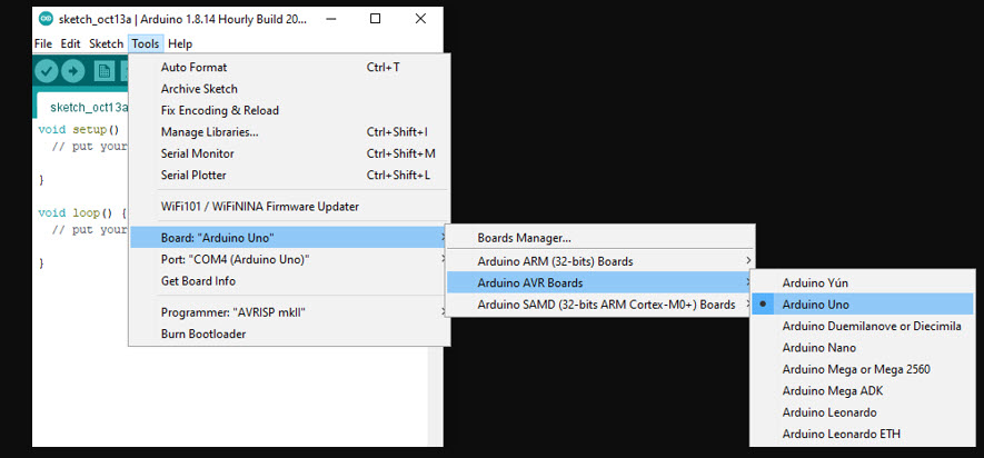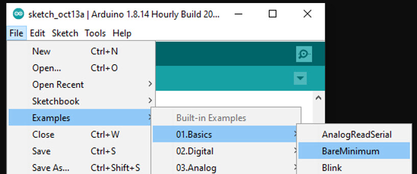 7. Navigate to: File > Examples > 01. Basics > BareMinimum