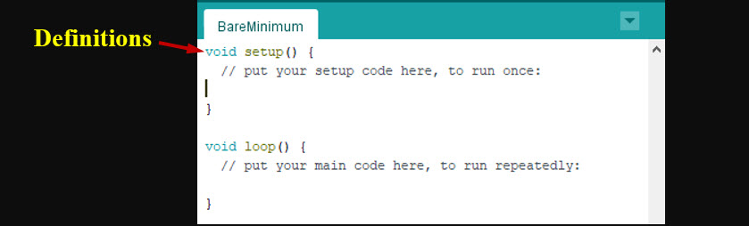- Definitions are declared prior to void setup and can include pin definitions, libraries to include in the sketch, functions, and global variables. Most programs declare something, but this is not required.