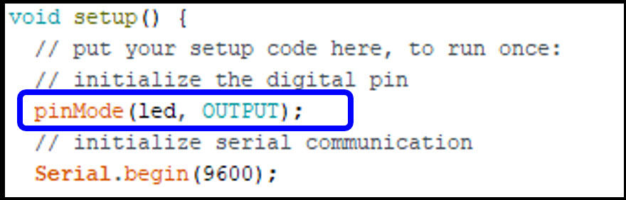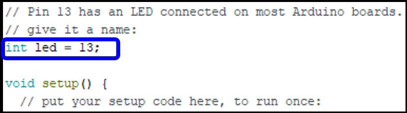 - We are telling the Arduino to let a variable called “led” represent an integer
