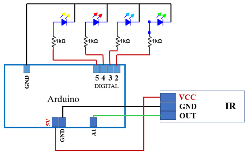 - Connect VCC from IR sensor to 5V on the Arduino